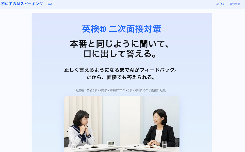 このサービスでは、AIが先生役となって質問を出し、即座にフィードバックしてくれます。間違っているところだけでなく、自然な言い回しも教えてくれます。しかも、英検二次試験の模擬面接モードまで搭載。本番さながらの練習ができるため、試験対策だけでなく日常的なスピーキング力アップにも活用できます。
