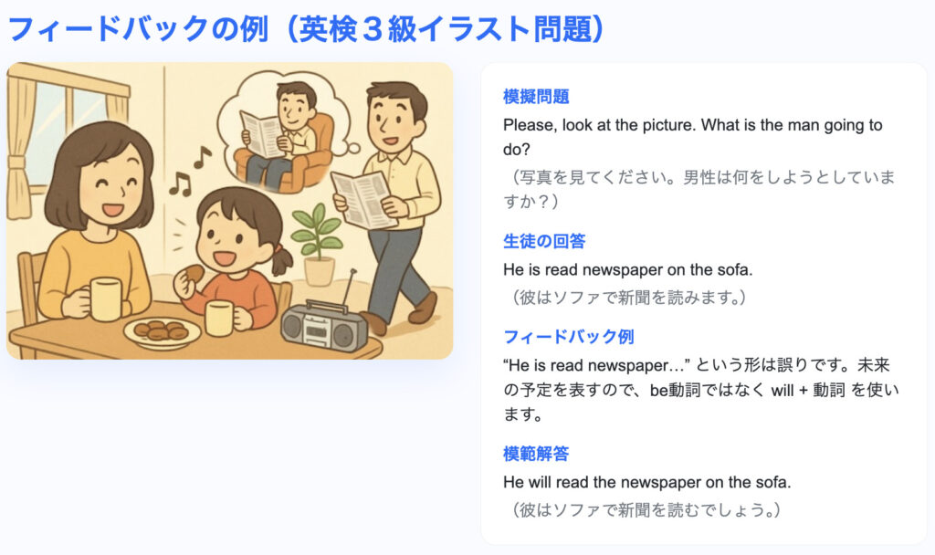 自分の発話内容をもとにした解答例も示してくれるので、英検の練習を通して自分の言いたいことが形になっていく実感が湧きます。