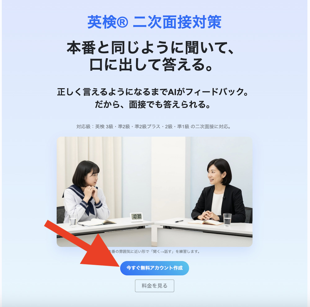 「初めてのAIスピーキング」では、英検二次試験(面接)の練習もできます。