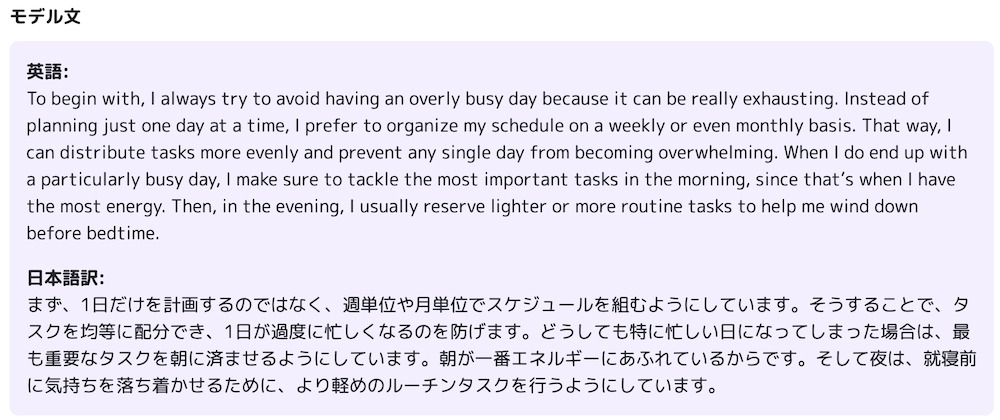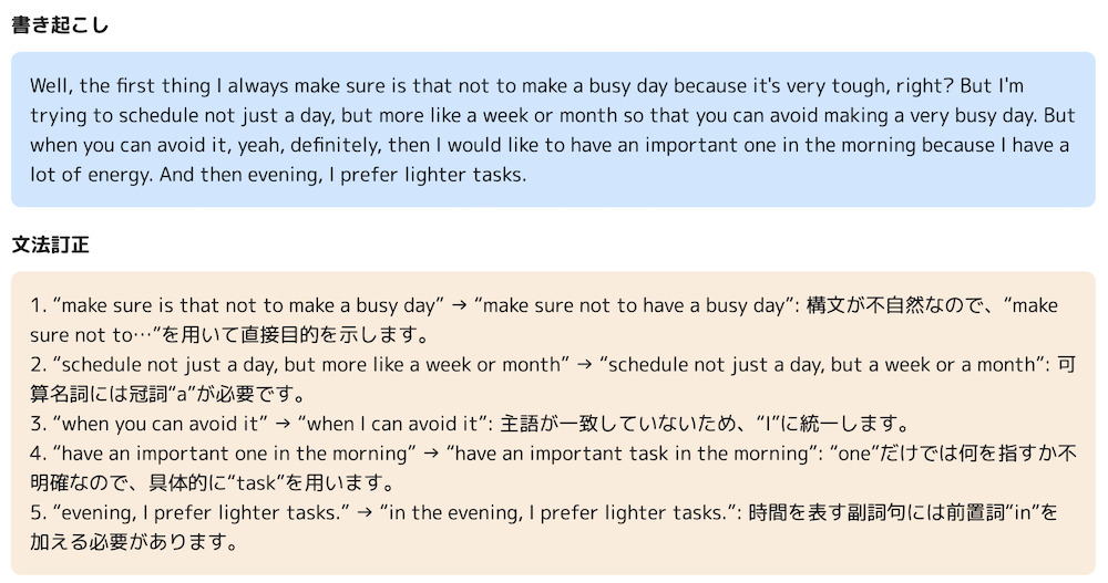 AIの聞き取り精度はかなり高く、ほとんど私が発話したままに書き起こしてくれました。文法の訂正は、間違いだけでなく、より自然な言い回しを教えてくれます。今回は、make sure is that not o make a busy day としたのを make sure not to という構文を使うと自然な表現になることを教えてくれました。