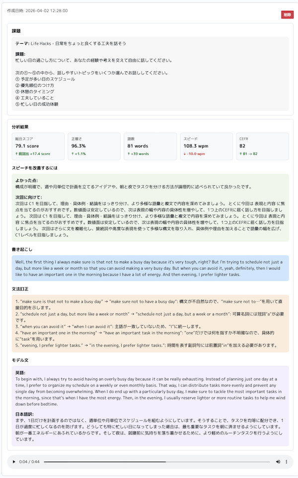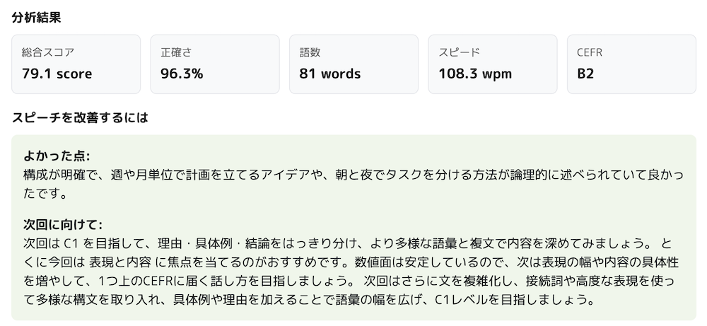 120秒が経過するか「停止」ボタンを押すと録音が終了します。スピーキング後に実際に表示されたのがこちらです。