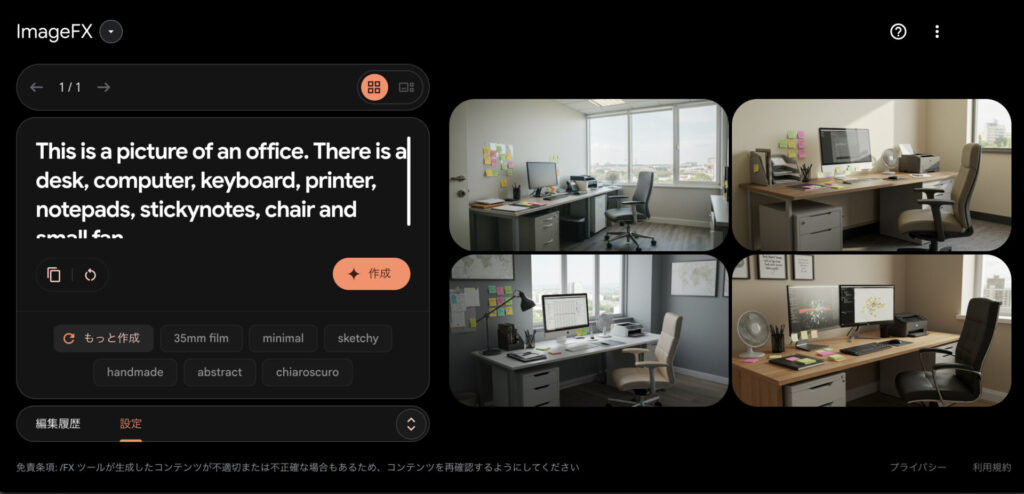 プロンプトのコツは、写真に含めたい内容を具体的に記述することです。今回は机やーパソコン、キーボード、プリンターなどを指定しました。複数枚作成してくれますので、気に入ったものを使用することができます。作成時間もChat GPTより短く、ストレスなく使えるのでオススメです。