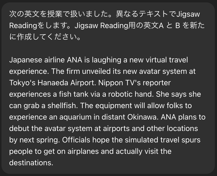 Jigsaw Reading を行うにはテキストをいくつかに分断する必要があります。Chat GPT なら作成も分断も全てお任せできます。