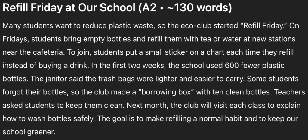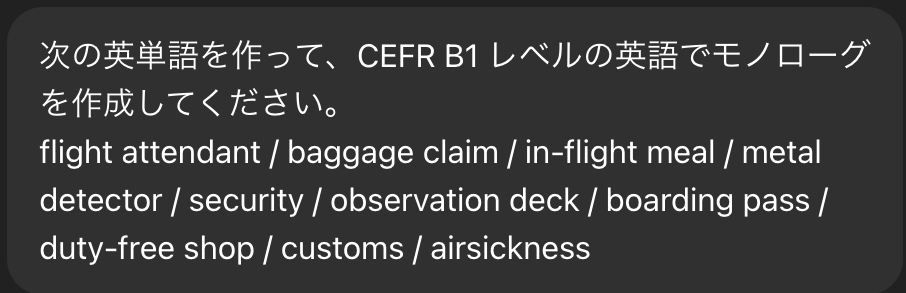 ディクテーションさせたい英文を用意します。手元に教材がない場合は、Chat GPTなどで作成しましょう。Chat GPT は CEFR を理解しますので、レベルを指定するとスムーズです。今回は、次のように指示しました。