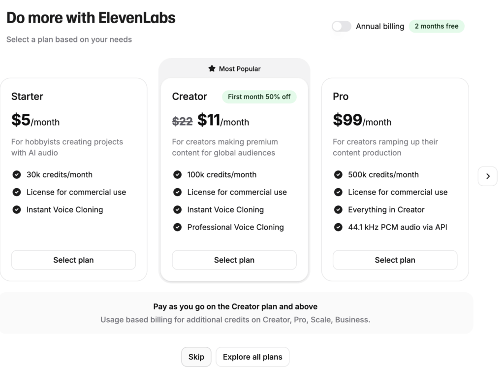 その後、アンケートに回答していくとプラン選択の画面が表示されます。よく見ると下部に skip がありますので、無料で利用したい場合はそちらを選択します。