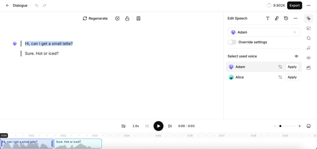 話者ごとに改行するのがポイントです。改行したら、行ごとに右側の Edit Speech からスピーカーを選択します。