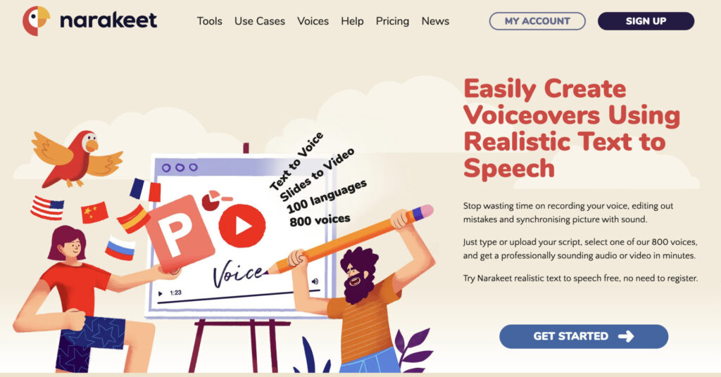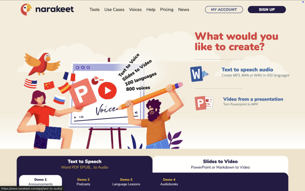 音声は Text To Speech (TTS) を利用すると簡単に作成できます。今回は、登録不要で利用できる Narakeet (https://www.narakeet.com/) を使用します。