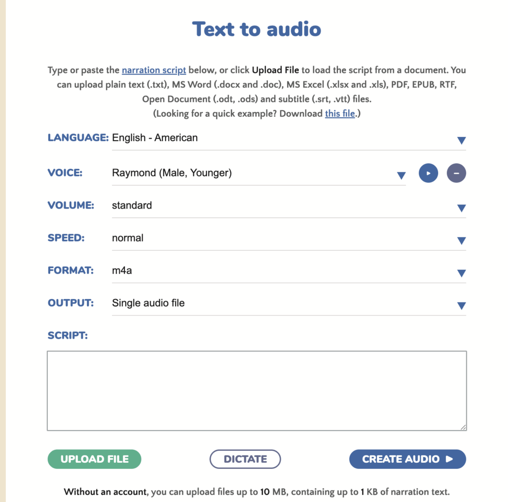 Narakeetの無料枠を使い切ってしまった後は、Luvvoice(https://luvvoice.com/)もおすすめです。こちらも登録なしで、音声生成ができます。