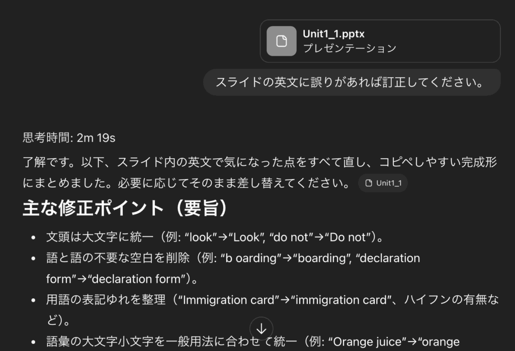 1つずつ貼り付けてもいいですが、面倒な場合は作成したファイルごと Chat GPT に投げると、やや時間はかかりますが一括で校正してくれます。その間に他の作業に取り組むのも◎