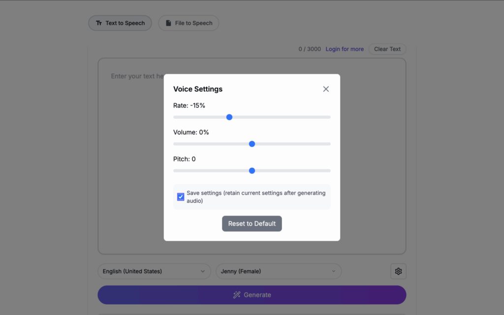 読み上げスピードの変更も可能です。アクセントや話者の右側に表示されている歯車アイコンをクリックすると Voice Settings が表示されます。Rate を下げると速度が下がります。