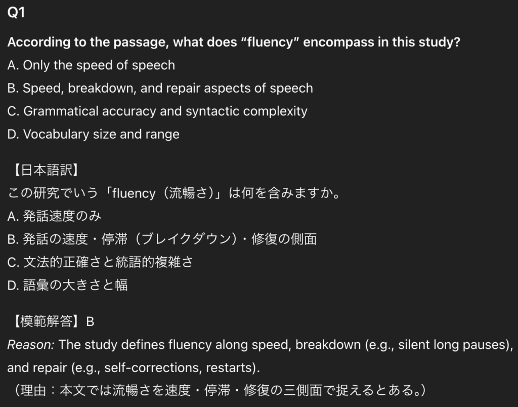 次のような問題を作成してくれました。訳も解説も問題なく出力されています。Chat GPTは間違えることもあるので、チェックは必要です。また英文のレベルは CEFR で指定することも可能です。