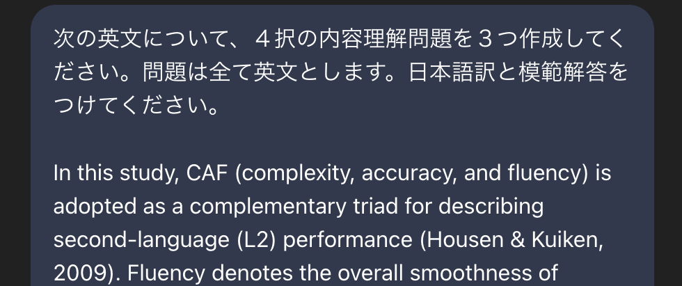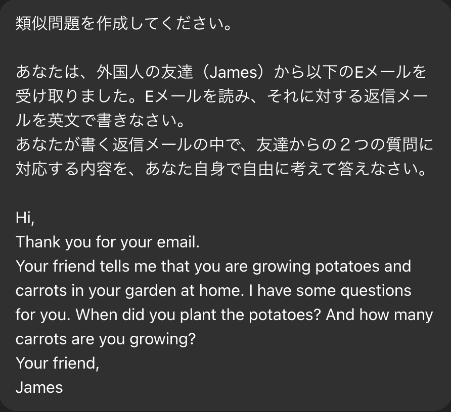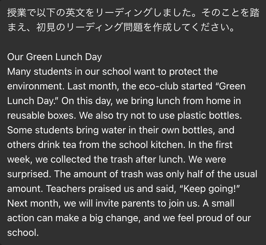 教科書本文を指導した後に、類似する英文で初見リーディングを行わせたい時にもChat GPT で簡単に英文を作成できます。テスト問題の作成にも活用できます。プロンプトには初見リーディング問題を作成して欲しい旨に教科書本文を添えるだけです。