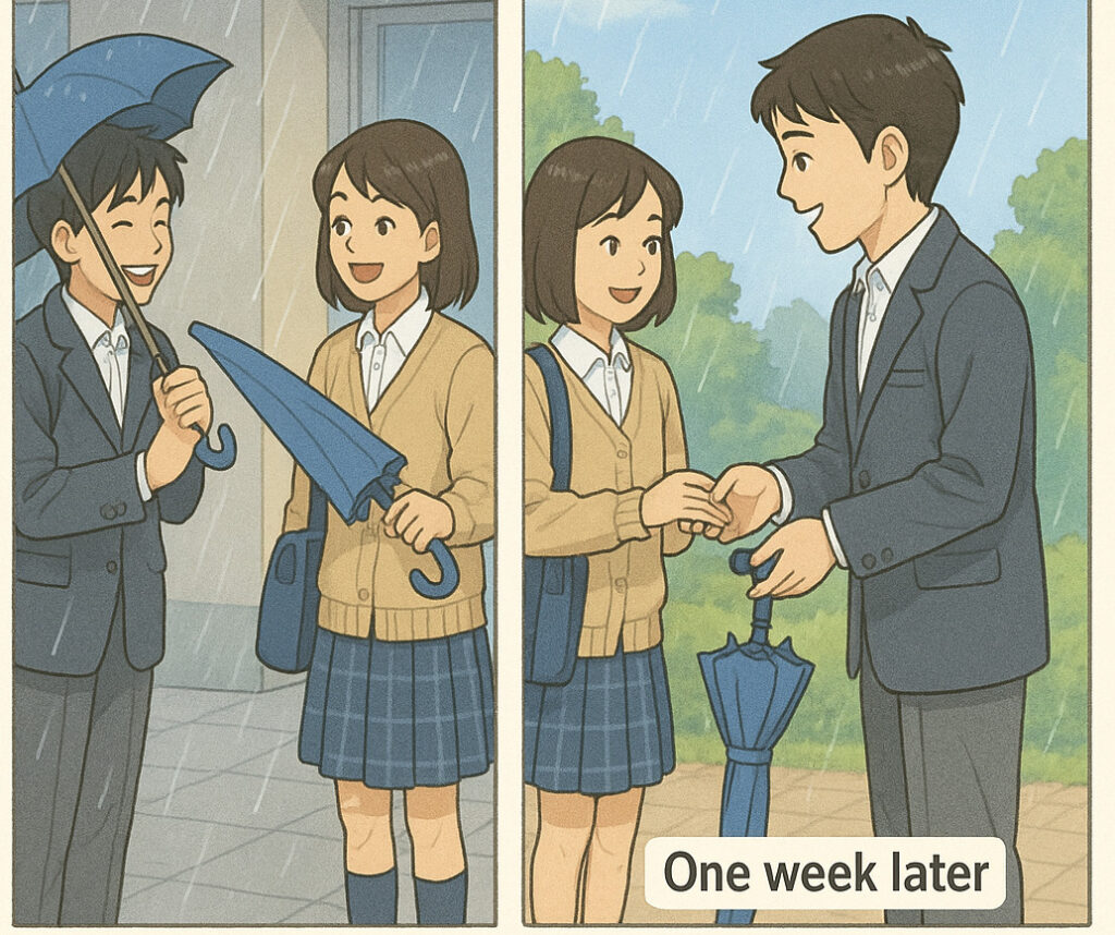 ストーリー例:ある男の子が傘を忘れる → 次の日 → 友達が傘を貸してあげる → 1週間後 → 彼がそれを返す。
