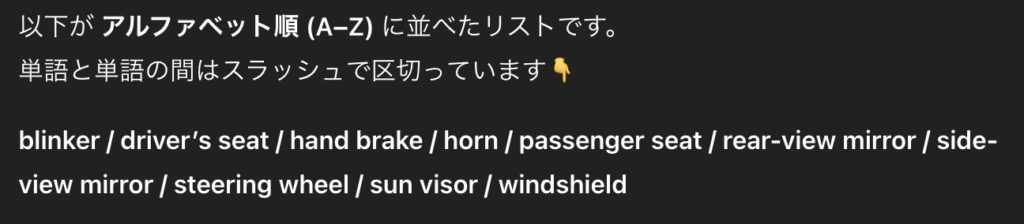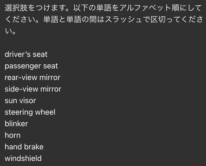 英単語を選択肢として提示するとき、意外と面倒なのが並び替えですよね。以前はエクセルなどでアルファベット順にしていました。それでも、区切りのカンマやスラッシュは自分で入れなければならなかったので面倒でした。Chat GPT なら全部任せられるのでだいぶ楽になりました。