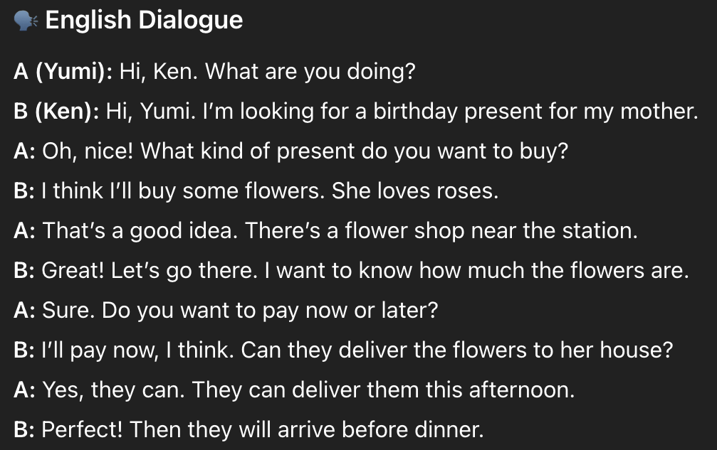 ダイアローグ(対話文)を作成する際は、テーマ、レベル、ターン数を指定するとイメージしている会話文が出力しやすいです。ほかに、登場人物の関係性を加えるとさらにリアルな会話になります。また、使う英単語を指定すると語彙学習を兼ねることもできます。以下、プロンプトと実際に出力された対話文です。