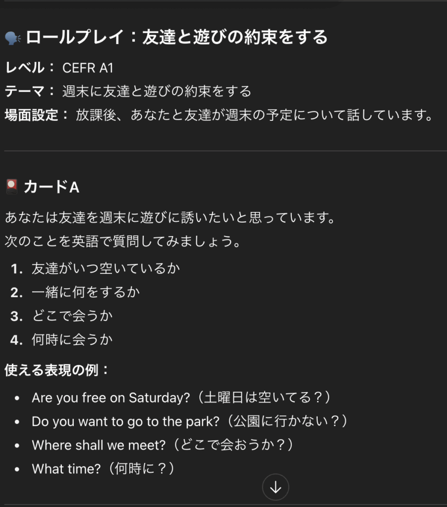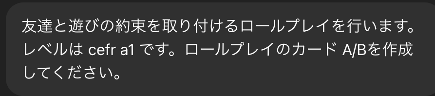 まずはプロンプトです。テーマとレベルを伝え、ロールプレイのカードを作成するよう指示します。
