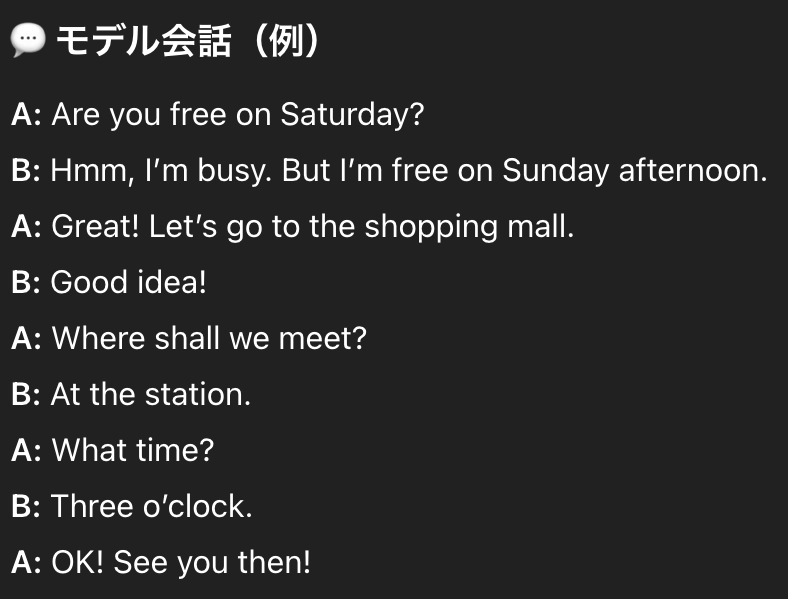 モデルの会話があると取り組みやすくなる生徒も多いです。活動後に模範解答として配布するのにも適しています。