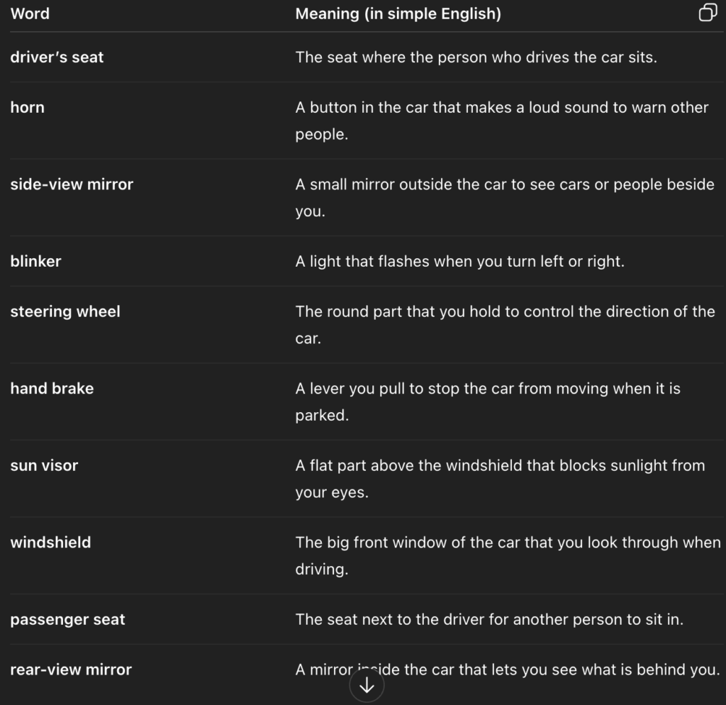 次の英単語の意味を CEFR A2 レベルの学生が理解できるような英語で説明して、表にまとめてください。左側に英単語、右側に単語の意味を英語で書いてください。 driver’s seat, horn, side-view mirror, blinker, steering wheel, hand brake, sun visor, windshield, passenger seat, rear-view mirror