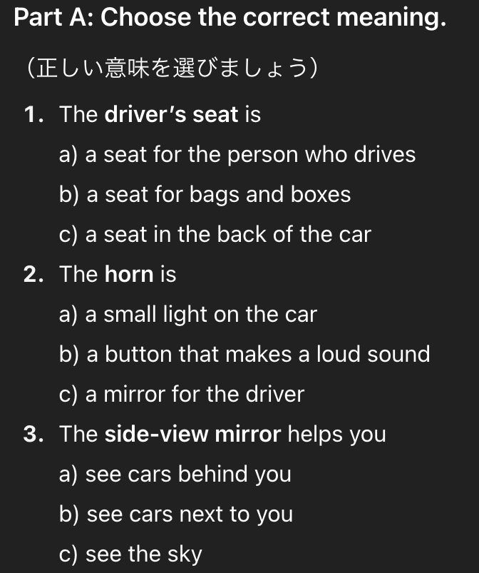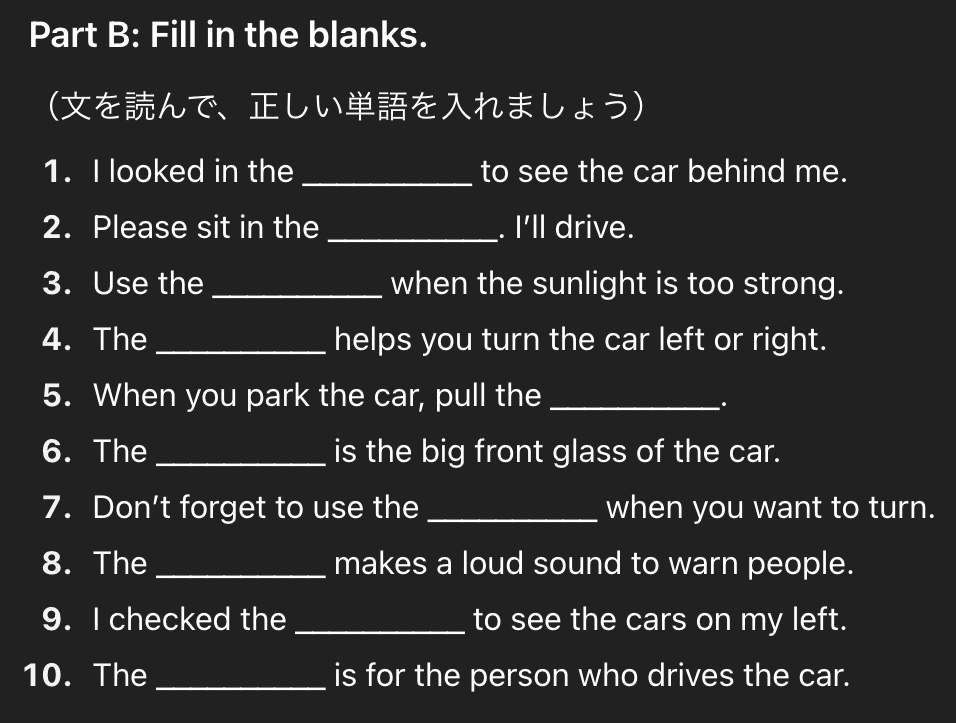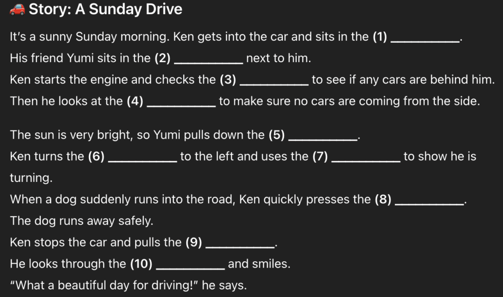 これらの英単語を使って、CEFR A2 レベルのストーリーを作成してください。ストーリーのうち、指定した英単語のいくつかを穴埋め形式にしてください。日本語訳と模範解答も生成してください。 driver’s seat, horn, side-view mirror, blinker, steering wheel, hand brake, sun visor, windshield, passenger seat, rear-view mirror