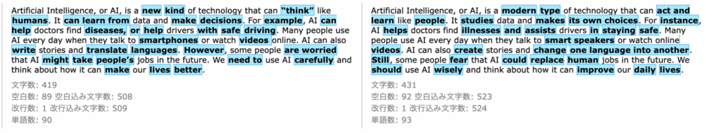念の為、元のテキストとパラフレーズされたテキストを比較してみました。青でハイライトされている部分が変更された箇所です。上手に言い換えられているのがわかります。