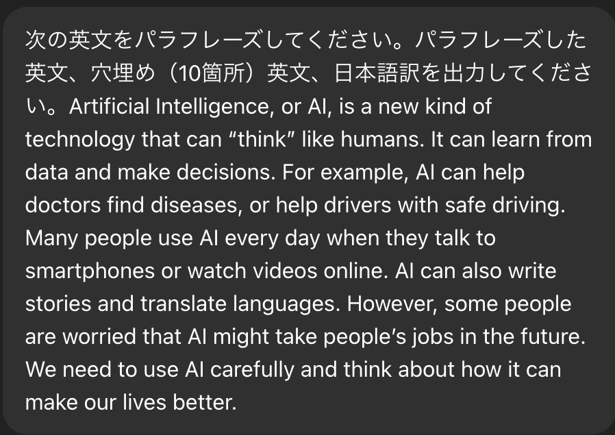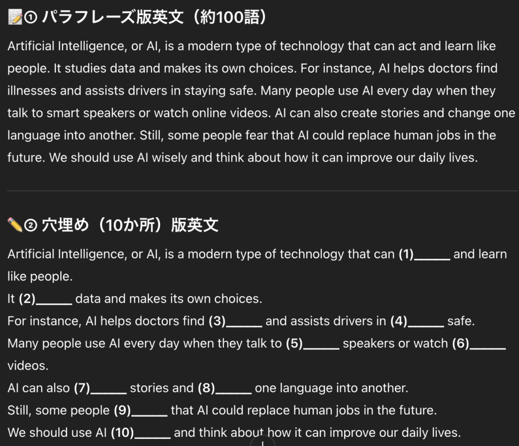 パラフレーズされた英文(リテリングの模範解答)と穴埋めテキストが生成されました。掲載していませんが、日本語訳もちゃんと出力されています。授業でも十分に使えるクオリティです。穴埋めは解答も作成させると便利です。