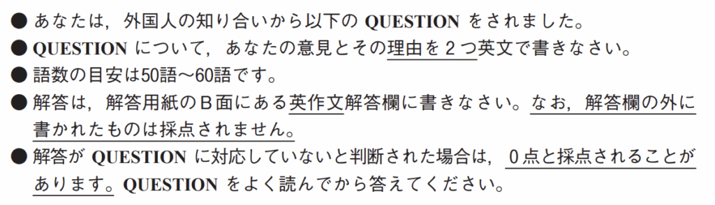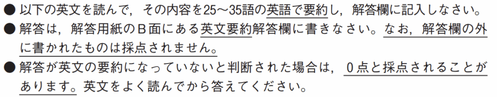 手順ははっきりしていますので、落ち着いて解答していきましょう。接続詞を上手に使えると全体がスムーズになります。また、自分の意見は書かないように注意しましょう。